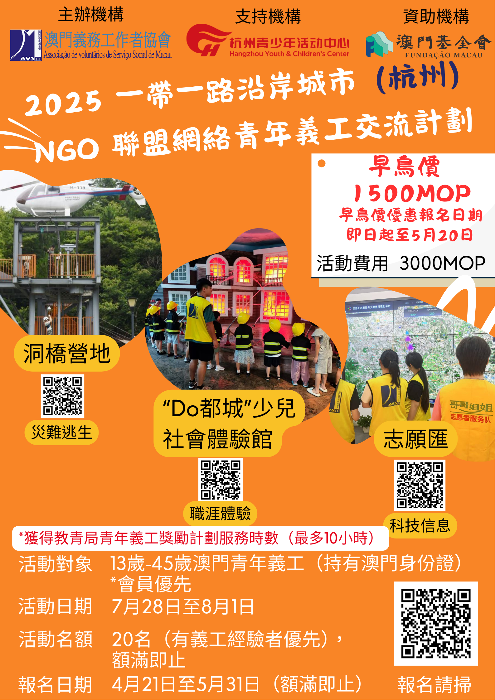 💵活動費用:早鳥早享受價格1500MOP(即日起至5月20日)5月20日後3000MOP包括來回機票、當地交通食宿、團體保險和按金MOP$5000, 完成外訪活動,按金將於活動完結後發回