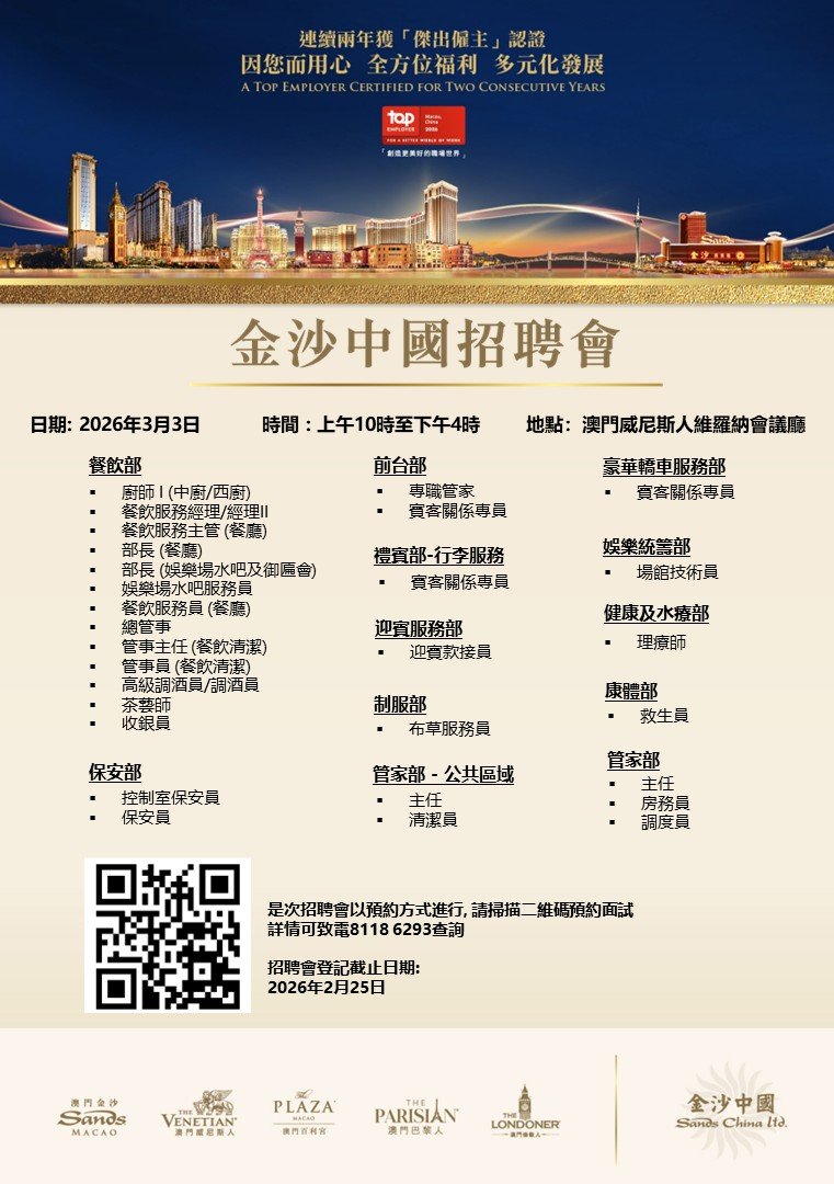 For enquiries, please contact us at(853)8590 8066. The positions are applicable for Macao residents only. All information provided will be kept strictly confidential and information will be used for the purpose of processing your application or other employment related matters.