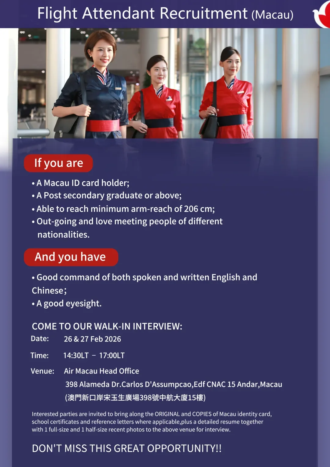 Interested parties are invited to bring along the ORIGINAL and COPIES of Macau identity card, school certificates and reference letters where applicable, plus a detailed resume together with 1 full-size and 1 half-size recent photos to the above venue for interview.