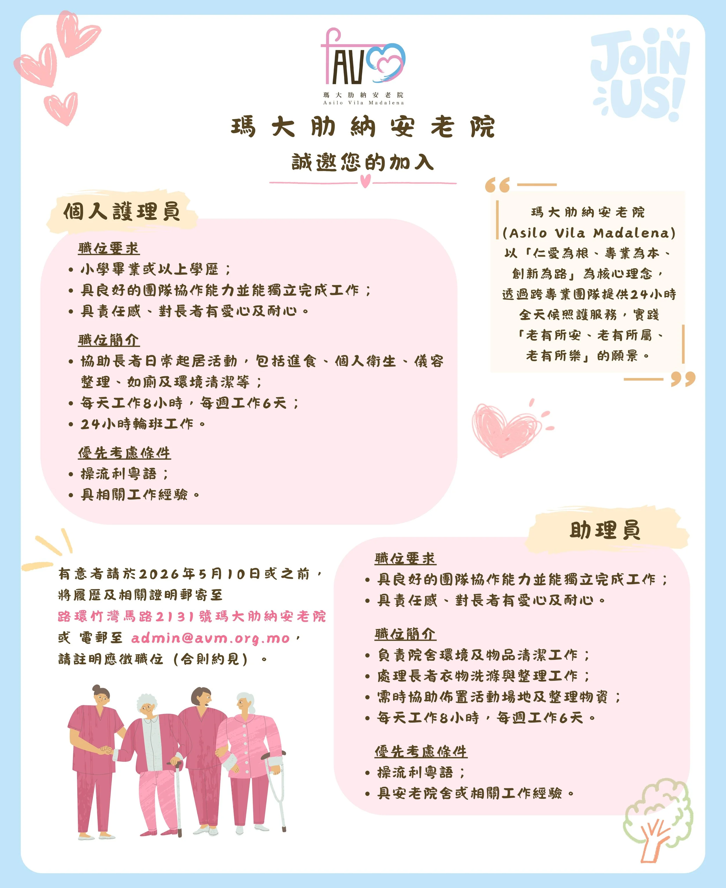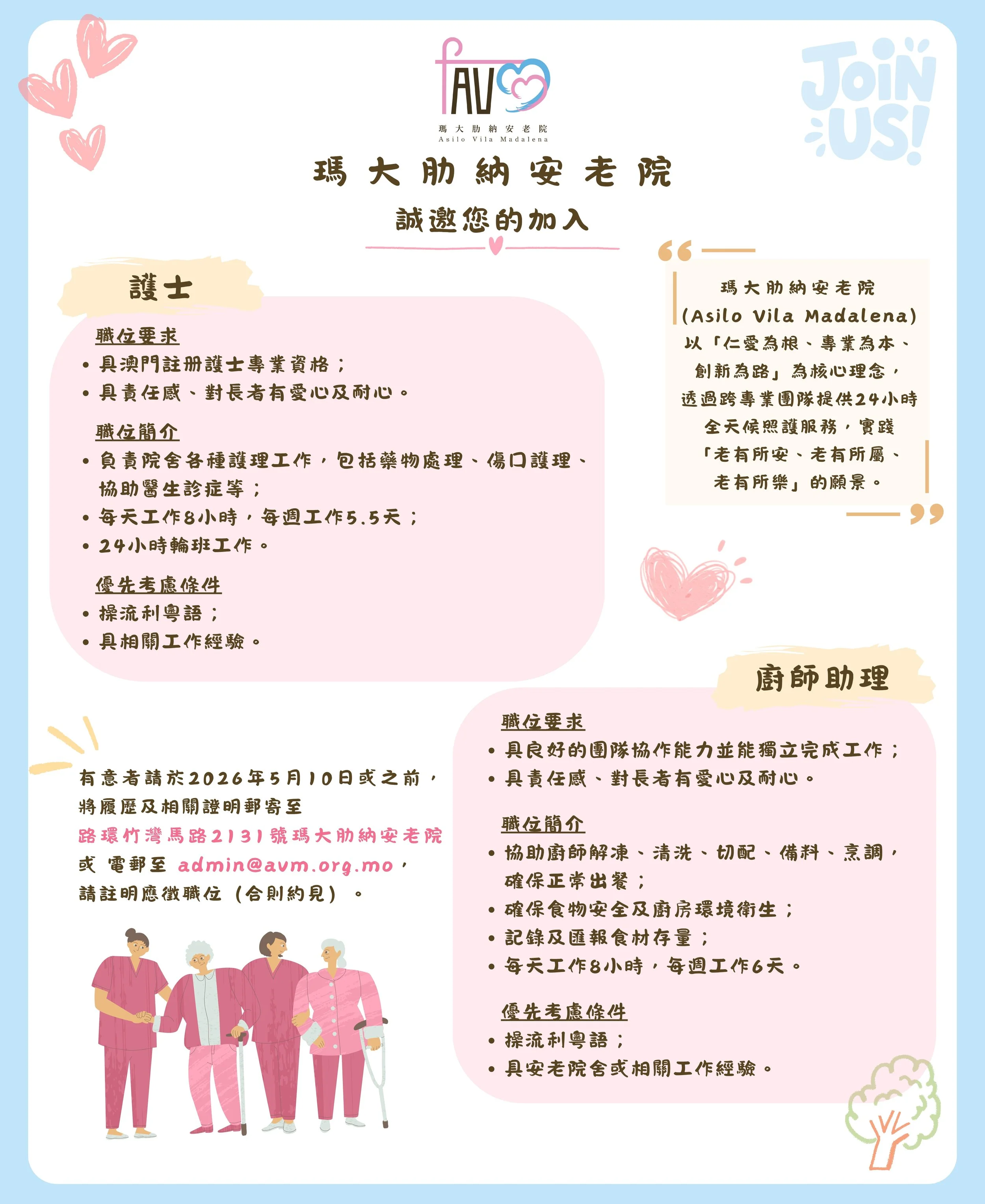 有意者請於2026年5月10日或之前,將履歷及相關證明郵寄至 路環竹灣馬路2131號瑪大肋納安老院 或 電郵至:admin@avm.org.mo,請註明應徵職位(合則約見)。