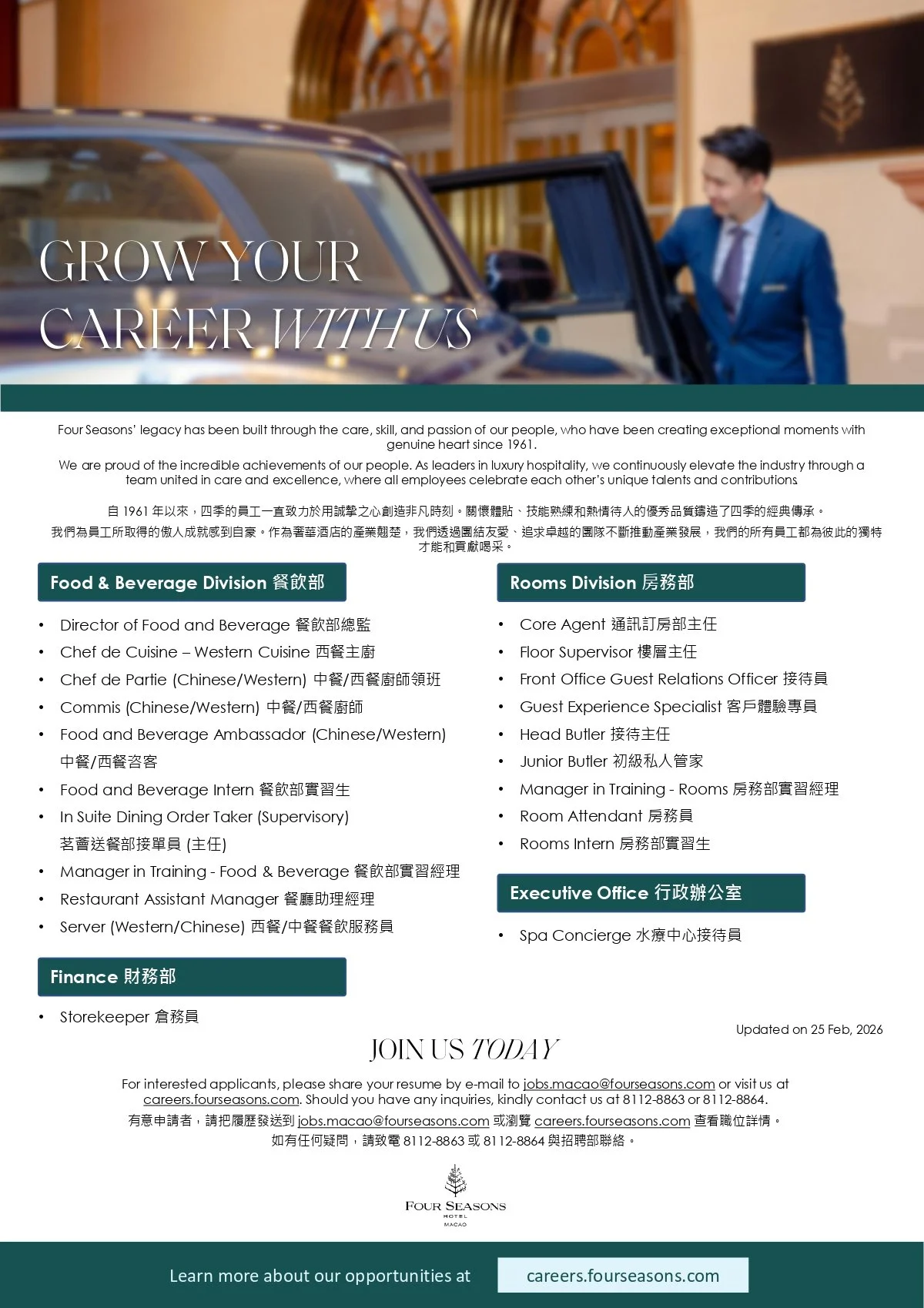 • 工作經驗:具最少三年於五星級酒店從事餐酒及餐飲的經驗者優先考慮