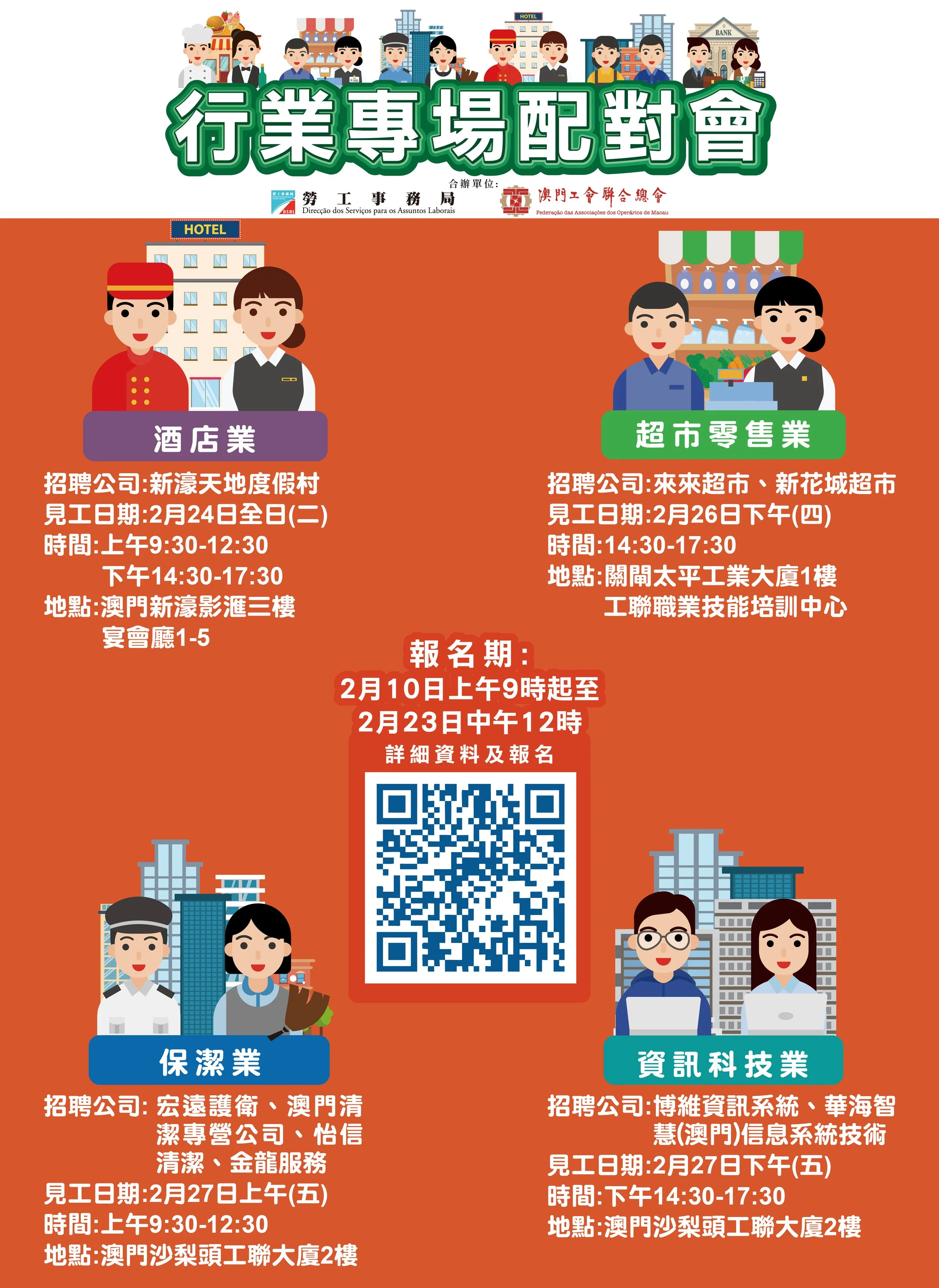 2月24日全日酒店業專場配對會在澳門新濠影滙三樓宴會廳1-5舉行;2月26日下午超市零售業專場配對會在澳門關閘馬路101-105A號太平工業大廈第一期1樓工聯職業技能培訓中心舉行;2月27日上午保潔業專場配對