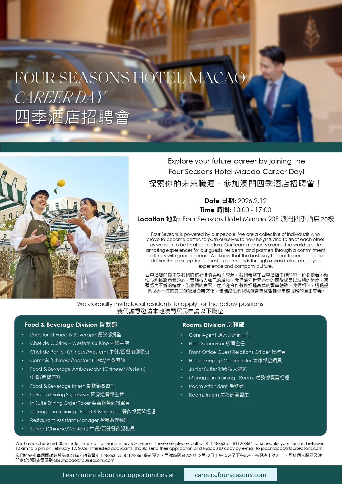 We have scheduled 30-minute time slot for each interview session; therefore please call at 8112-8863 or 8112-8864 to schedule your session between 10 am to 5 pm on January 20, 2026. Interested applicants, should send their application and Macau ID copy by e-mail to jobs.macao@fourseasons.com