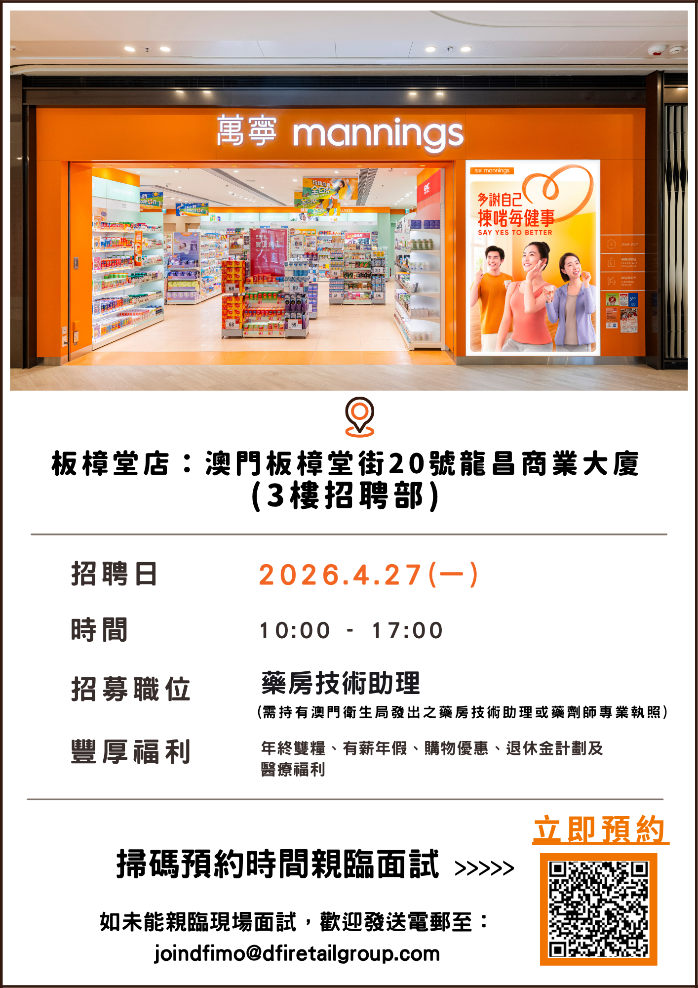 [ 4 月 27 日 ] Mannings 萬寧招聘日
