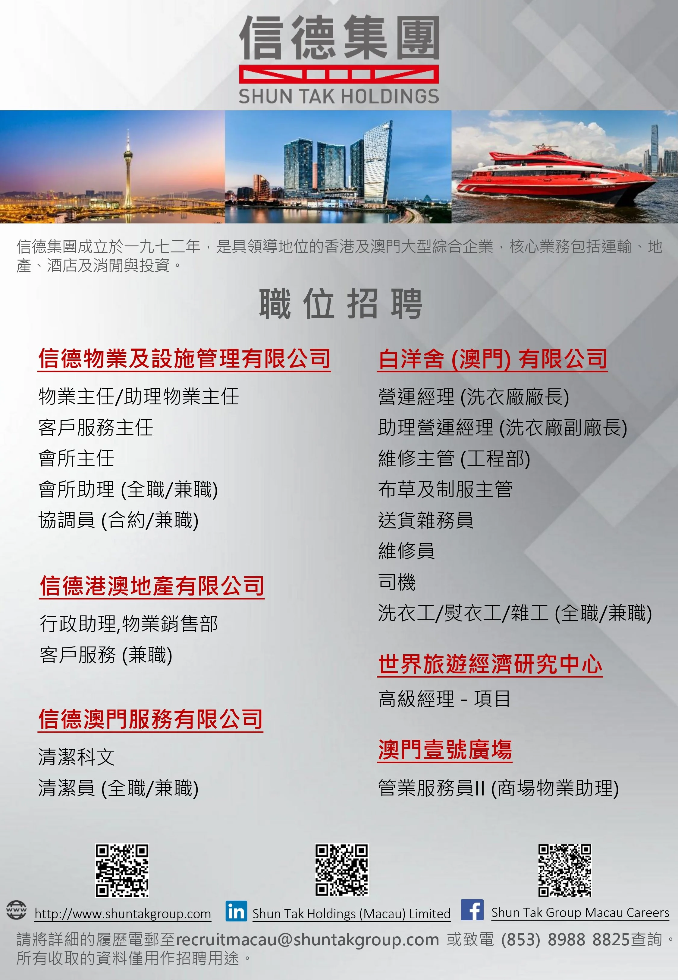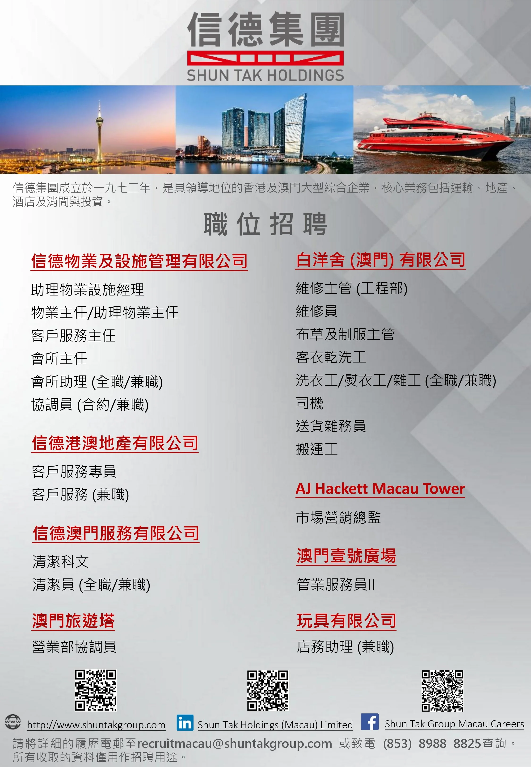 We offer long-term career prospects and competitive remuneration packages to the right candidates. Interested parties should send the detailed resume with expected salary to The Group Human Resources Department, Macau Tower Convention & Entertainment Centre, Largo da Torre de Macau, Macau or email to recruitmacau@shuntakgroup.com or contact (853) 8988 8825 for inquiries.