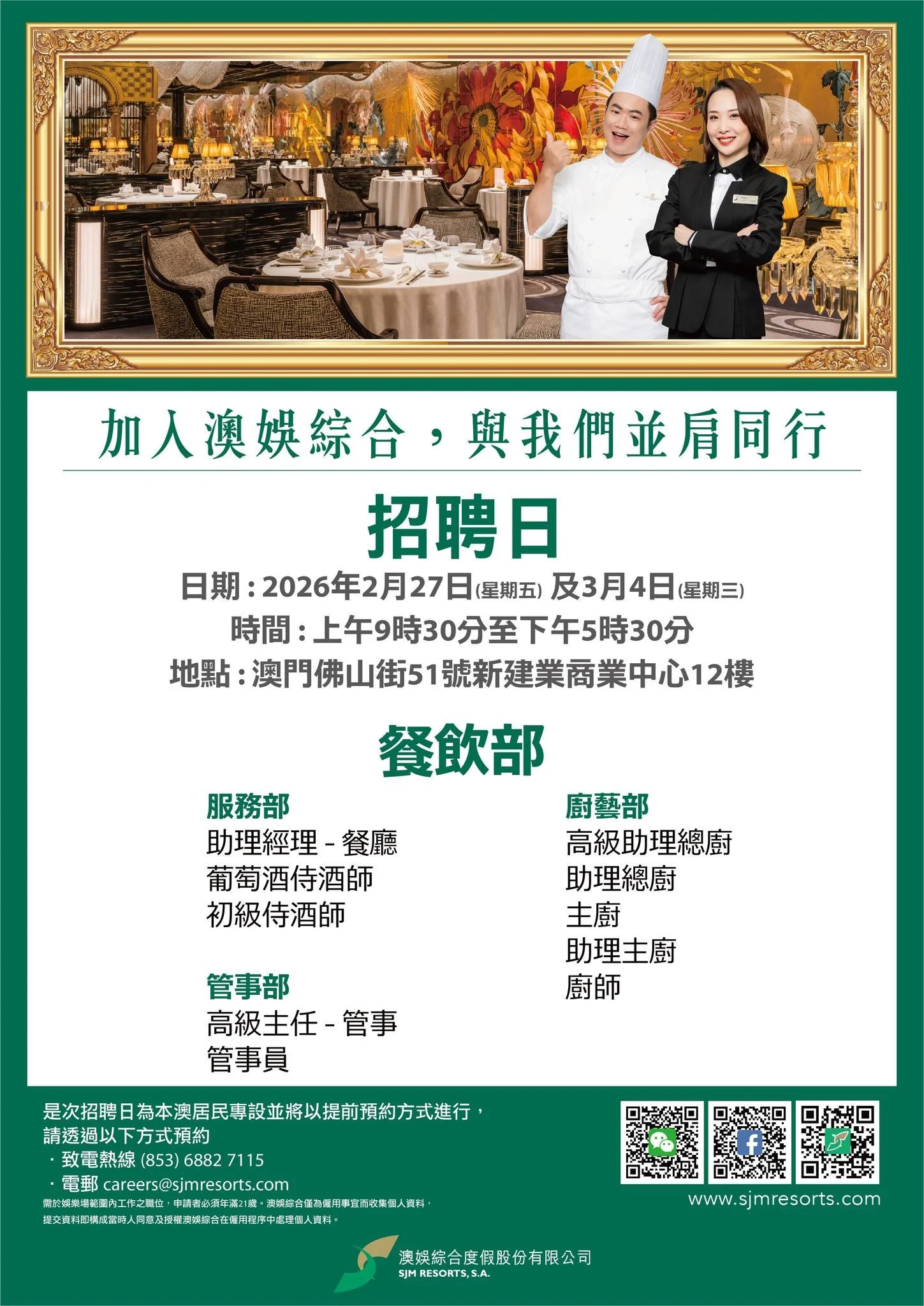 預約專線 (853) 6882 7115 或電郵至 careers@sjmresorts.com 查詢或預約面試。