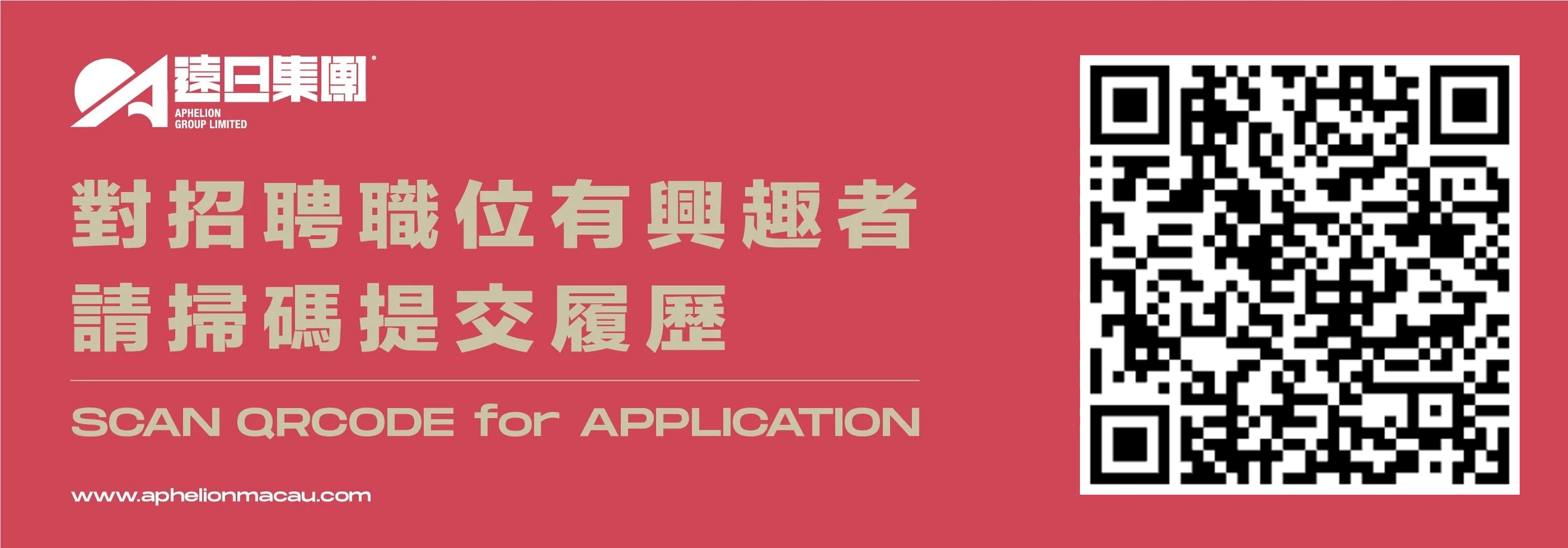 對招聘職位有興趣者請掃描下方二維碼或點擊連結遞交履歷 https://orbit-aphelion.com/public/form/712cc4ca81d5412c8fa8d0a3bc429659 或電郵履歷至 headoffice@aphelionmacau.com