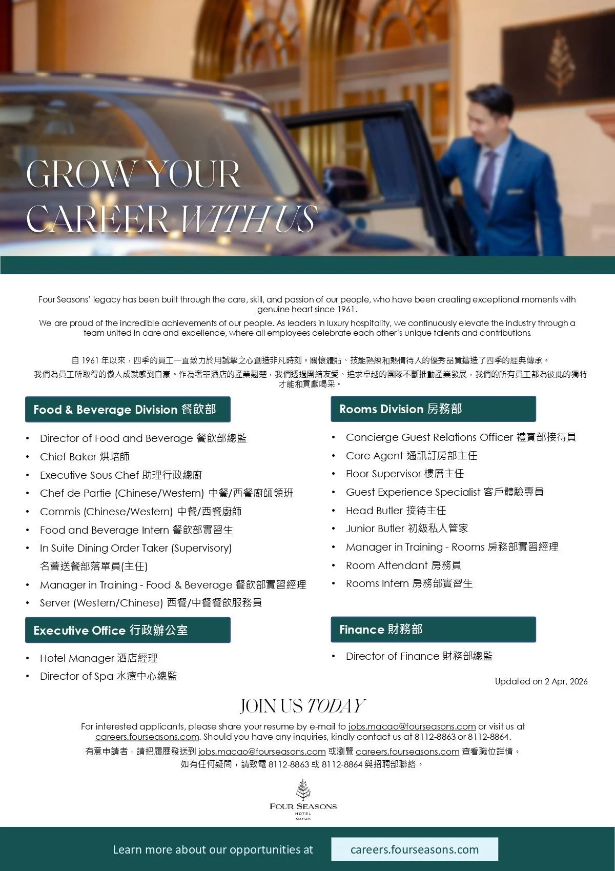 Four Seasons Hotel Macao offers various career development opportunities, industry-leading benefits and a pleasant working environment. Join our motivated, dynamic and enthusiastic team and develop your career with us.