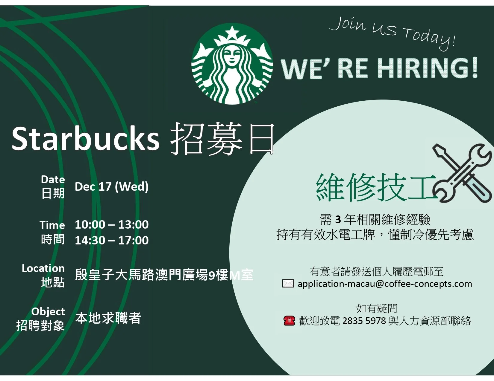 有意者,請將簡歷發至 claireliu618@gmail.com 或致電 +853 2845 3747 劉小姐