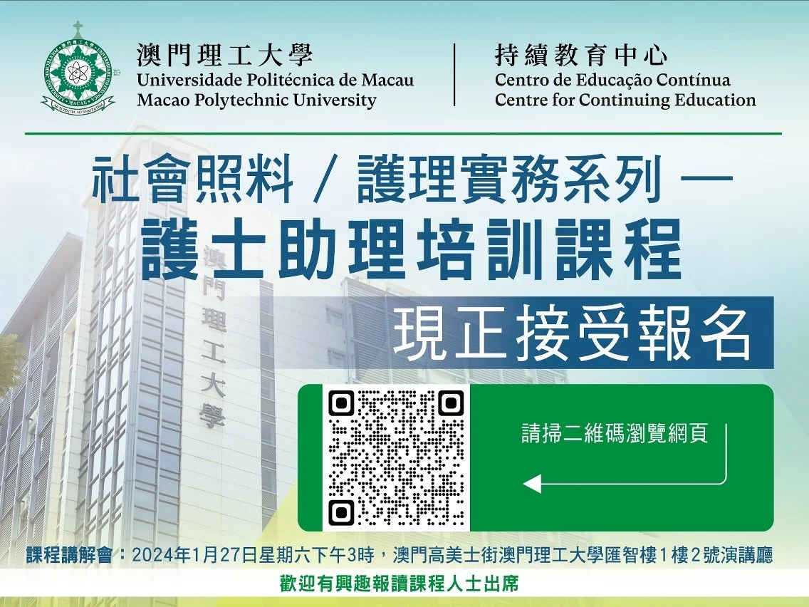 為了讓報讀人士深入瞭解課程目標、教學安排、報名手續等,將於2024年1月27日(星期六)下午3時於高美士街澳門理工大學匯智樓一樓2號演講廳舉行“護士助理培訓課程”講解會,歡迎對課程感興趣的人士及團體參加。
