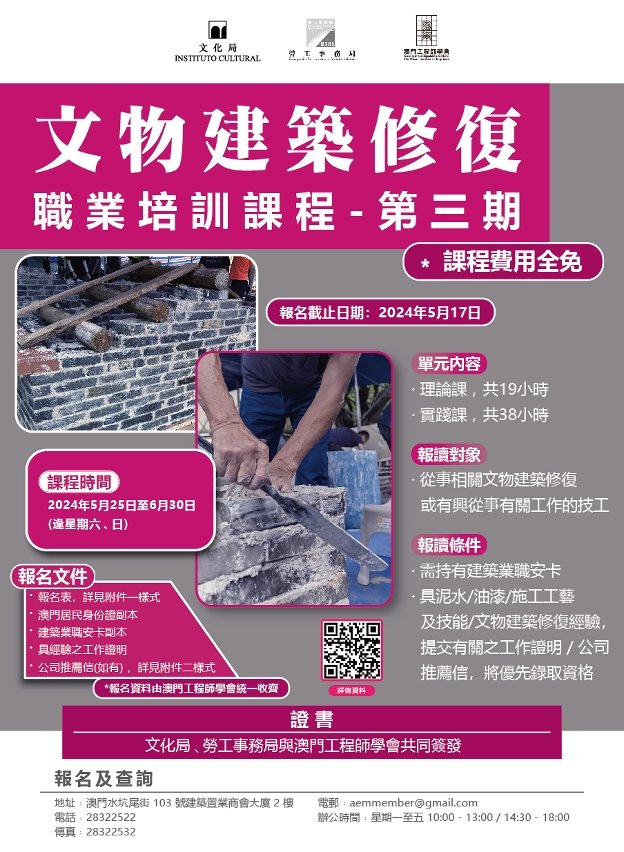 “文物建築修復職業培訓課程”由文化局、勞工事務局與澳門工程師學會合辦,旨在培養本澳文物建築修復人才,課程將於本年5月25日至6月30日期間(逢星期六、日)續辦第三期,課程費用全免,完成課程並通過考核之學員將獲發證書,歡迎現正從事或有興趣從事文物建築修復工作的澳門居民報讀。