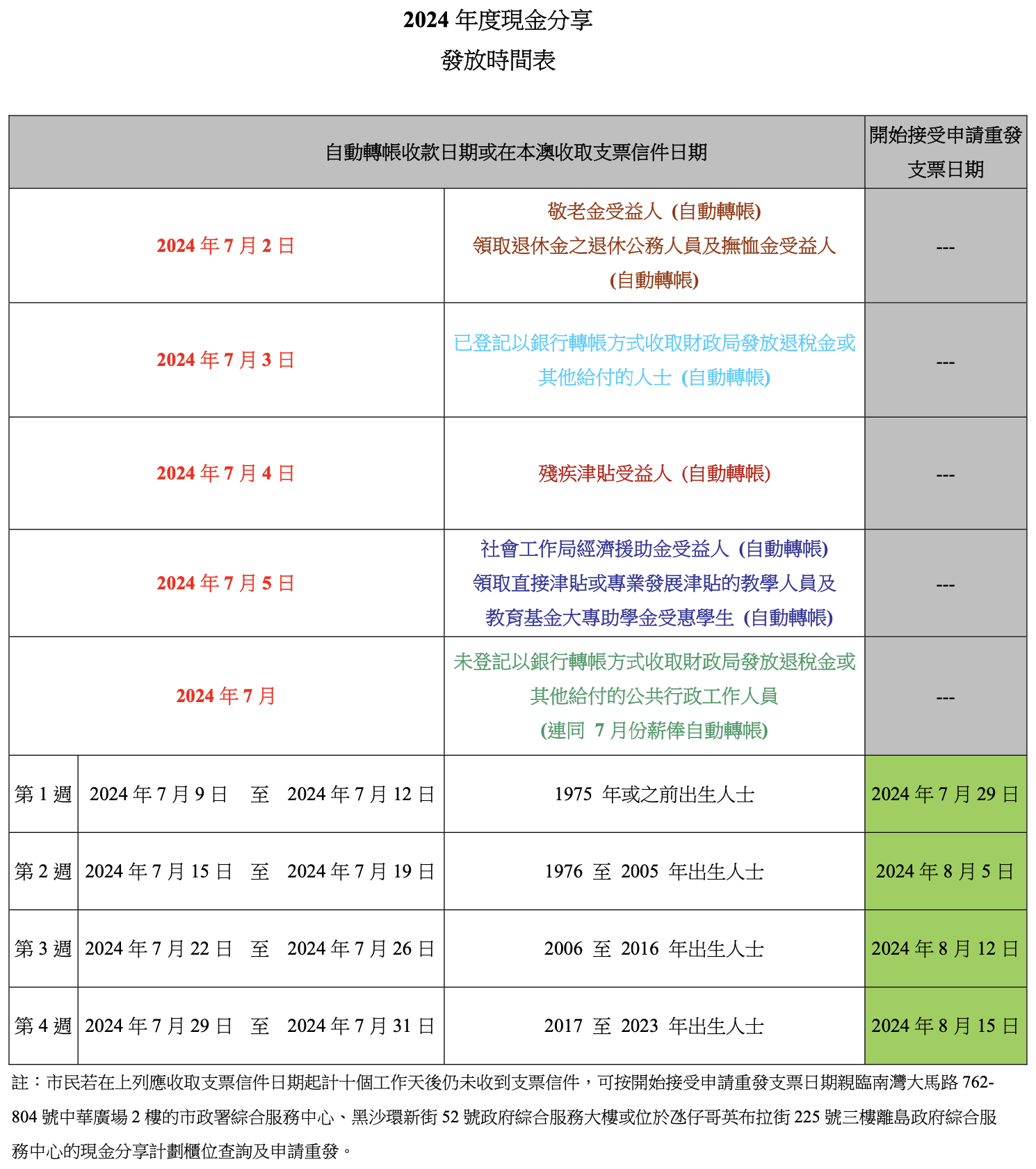 本年度現金分享計劃的發放安排與去年相同,主要以銀行轉帳或郵寄劃線支票兩種方式向合資格居民發放款項,其中領取各項津貼、援助金、助學金及公職人員報酬,以及已選擇以銀行轉帳方式收取退稅金或其他給付的人士,現金分享款項將直接轉入其帳戶;至於其他合資格的居民,則會按出生年份的先後順序,在四周內向其郵寄劃線支票。