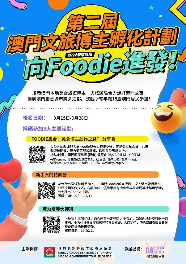 此外,9月25日在 “澳門國際旅遊 (產業) 博覽會” 舉辦期間,主辦單位將於當日下午3時舉行“FOODIE集合!美食博主創作之路”分享會,邀請內地及澳門人氣美食網紅出席,歡迎有興趣人士可掃描活動宣傳海報二維碼報名參與。名額有限,額滿即止。