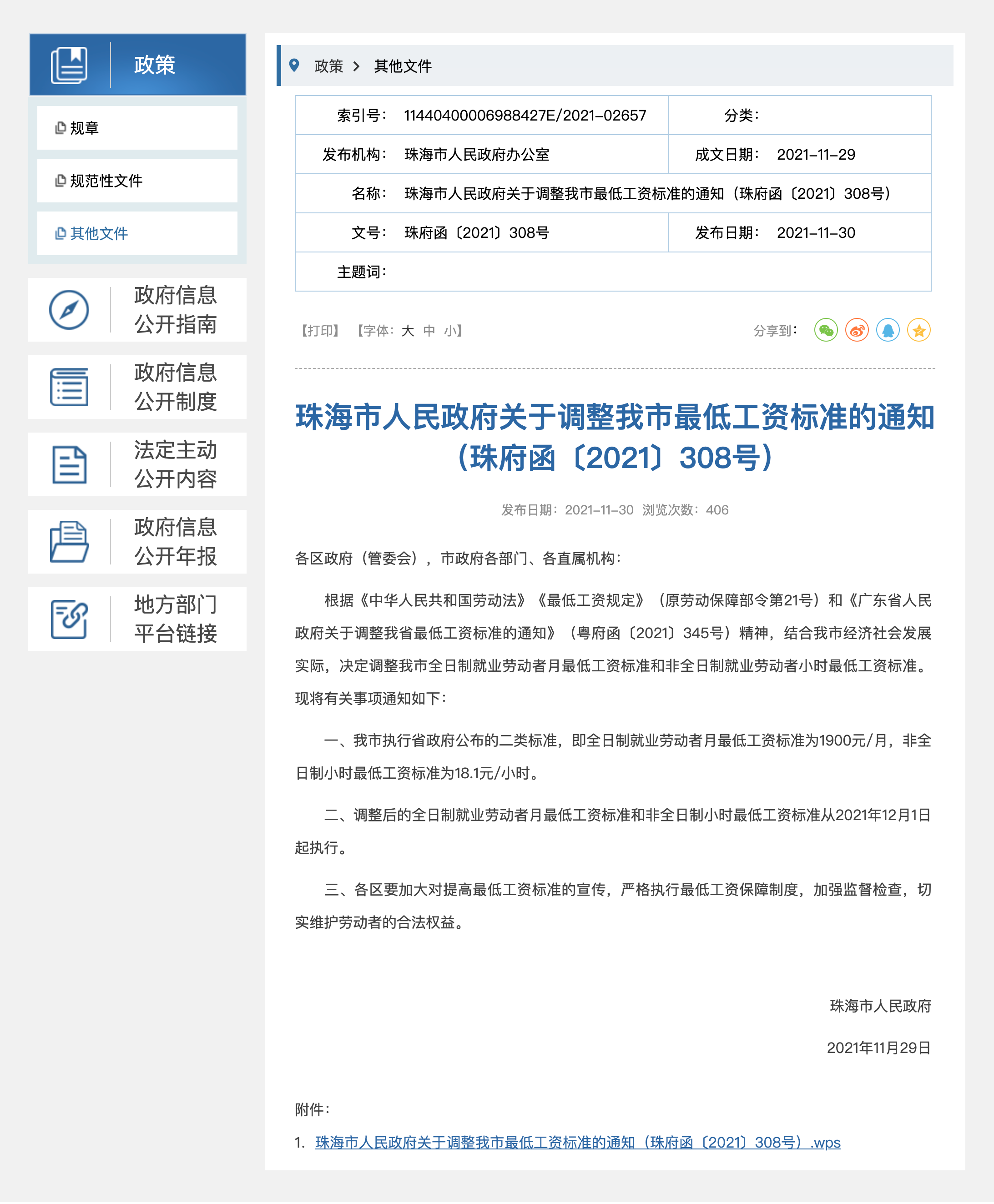 據珠海市最新公佈,從2021年12月1日執行廣東省政府公佈的二類標準,全日制就業勞動者月最低工資標準為每月1,900元,非全日制小時最低工資標準為每小時18.1元。
